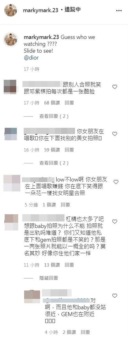 虽然Mark惨遭众多网友出征,但是仍有部分网友留言说:“拍照就是出轨吗?你们又知道他私底下跟GEM拍照都是不笑的?那是一两张照片就能以一概全的吗”、“对啊,而且他跟baby都没站很近,GEM也在附近”。风波发生后,目前邓紫棋和Mark都未对外回应。