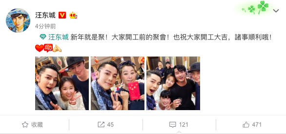 来源:【网易娱乐】 11日下午,汪东城分享了与蓝心湄等好友聚会的照片,他写道“新年就是聚,大家开工前的聚会,也祝大家开工大吉,诸事顺利”。照片中,林心如霍建华也久违露面,林心如甜笑比V,霍建华戴着棒球帽微笑合影,现场气氛十分融洽。