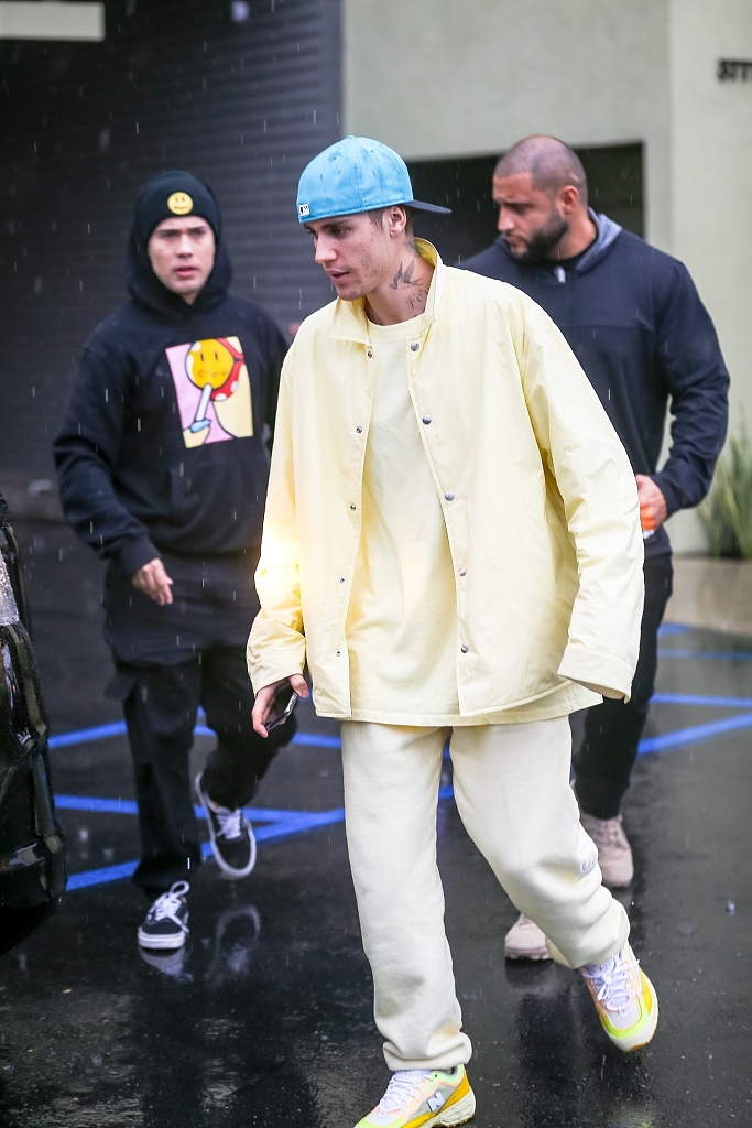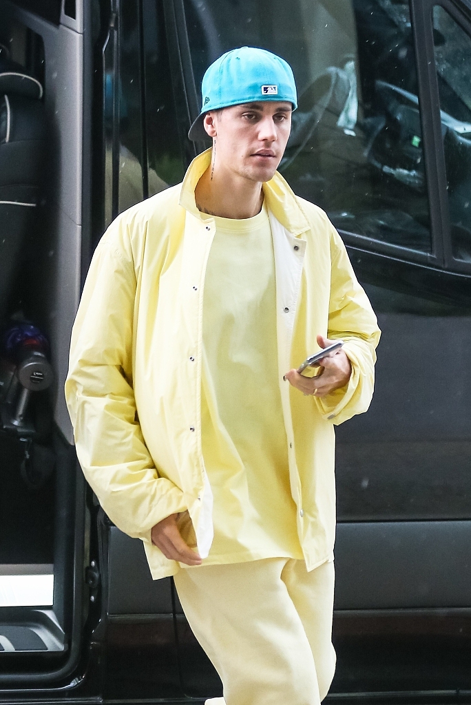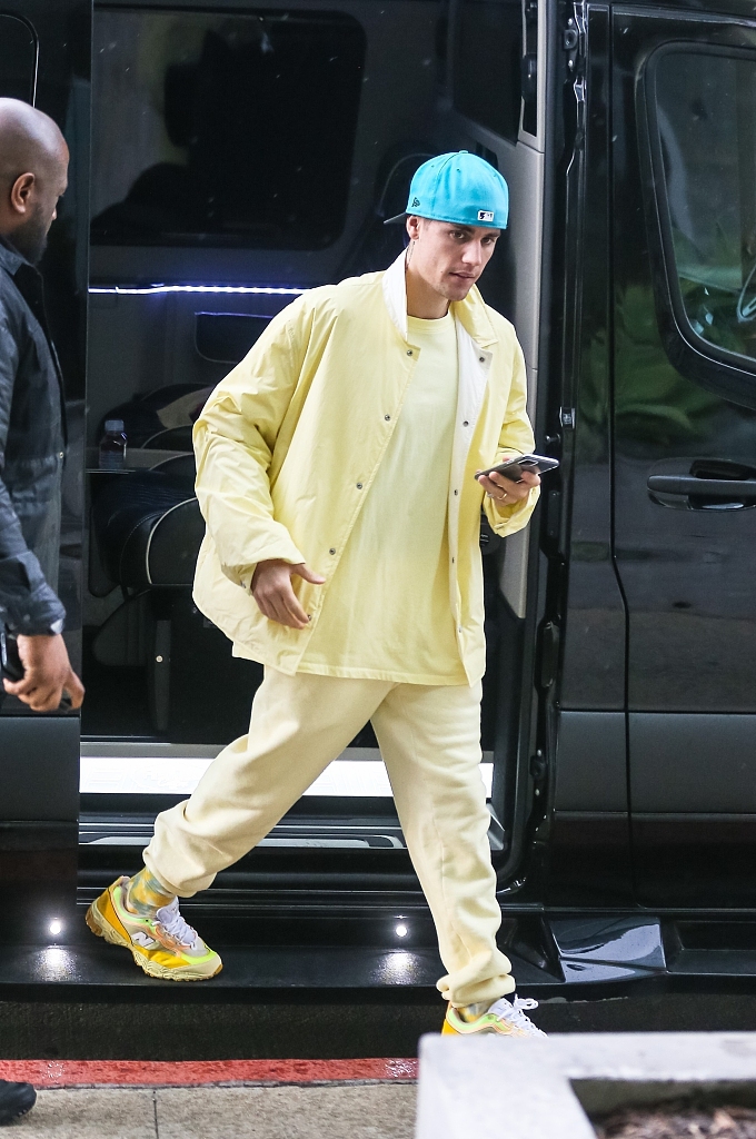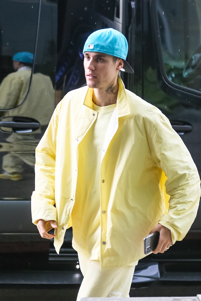 比伯穿黄色套装青春洋溢 反戴帽子酷帅不羁