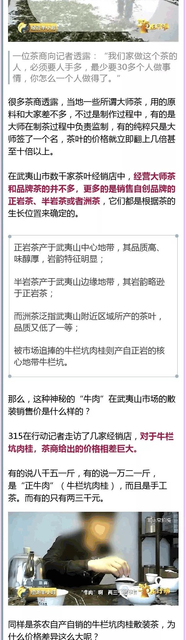 近几年来,武夷山的岩茶,风头很足,简单的一盒茶叶,动辄就是所谓大师手工制作,著名坑口的原料,每斤上万元、十几万元甚至几十万元。很多消费者都在发出疑问,这些充满传说、故事连篇的天价岩茶,真的值那么多钱吗?央视315在行动的记者走进了武夷山茶区进行了调查。
