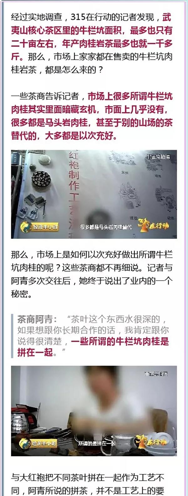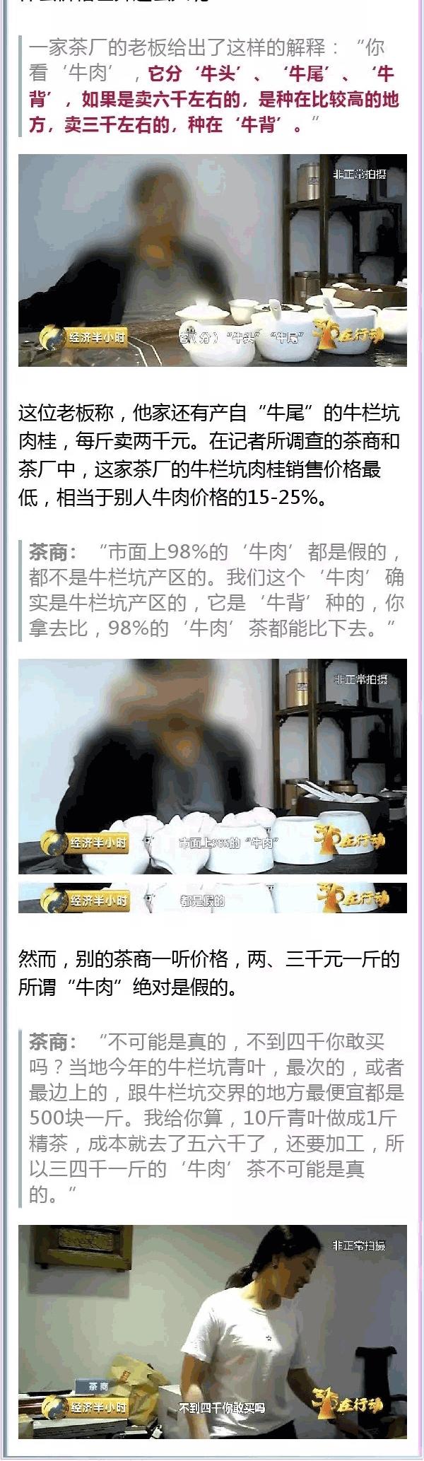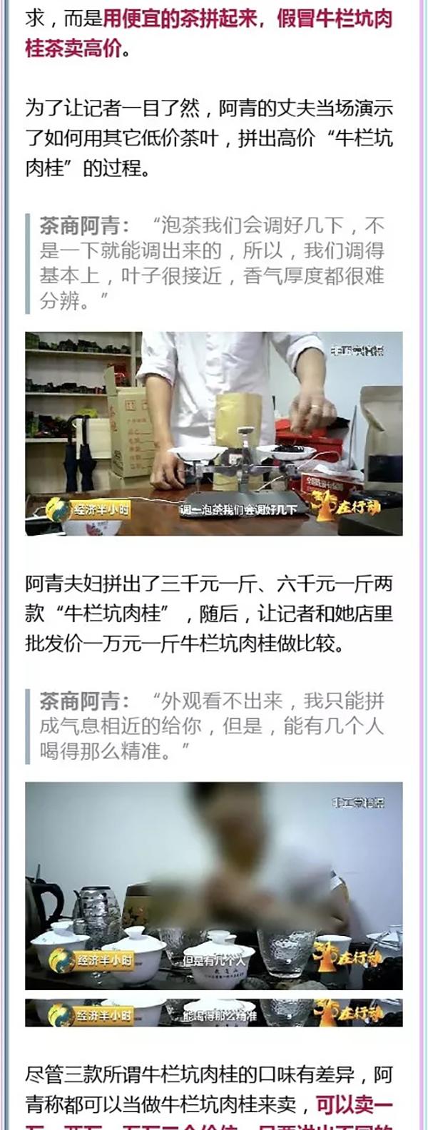 节目最后那位茶商的一声叹息,意味深长。喝茶是一件修身养性的好事,但也是普通民众生活中,最普通的一件事。但制造噱头,编造故事,端出所谓制茶大师,最终导致了茶叶市场上的种种乱象。天价岩茶的出现,归其根本,还是一个利字,为了挣取更多的钱。茶商,茶贩欺骗消费者的手法层出不穷,一些所谓大师,也鱼龙混杂,粉墨登场,一轮高过一轮的天价岩茶背后,真正种茶的茶农,和真正喝茶的消费者,成为了最终的受害者。茶叶是用来喝的,不是用来虚假炒作,欺骗消费者的,我们希望管理部门好好管管这些违规的商贩,我们也提醒消费者,茶叶没有天价,消费要当心骗子。