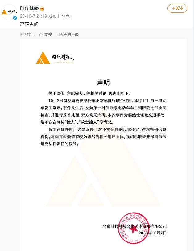 时代峰峻就网传“左航撞人”发布声明:本次事件为偶然性轻微交通事故,不存在网传“撞人”、“故意撞人”等情况
