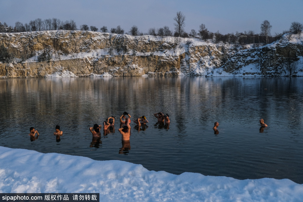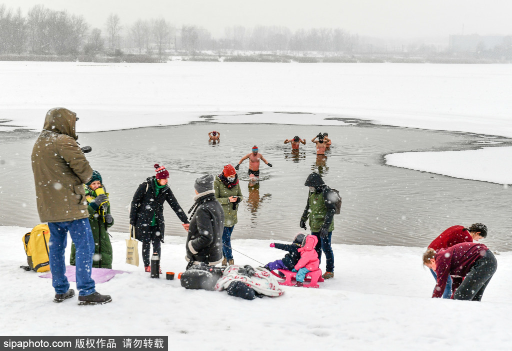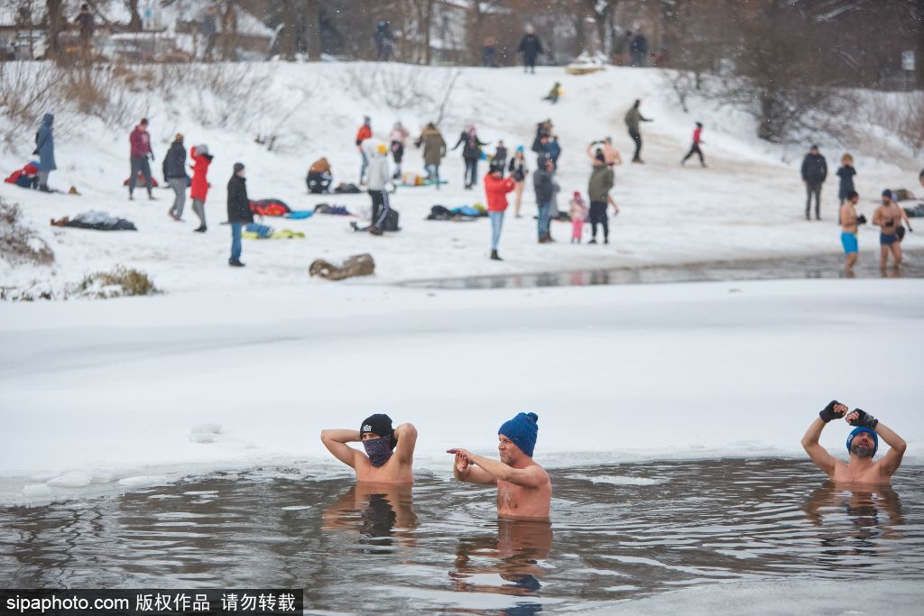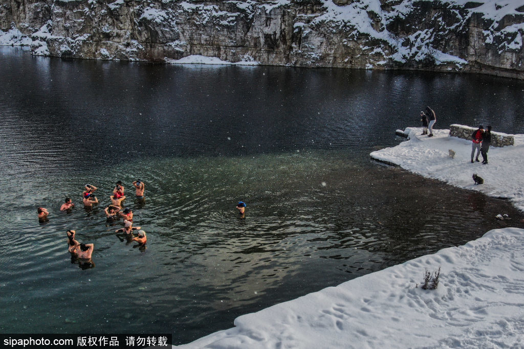 “看着就冷!”波兰人冰湖中泡澡游泳 伴随雪花成靓丽一景