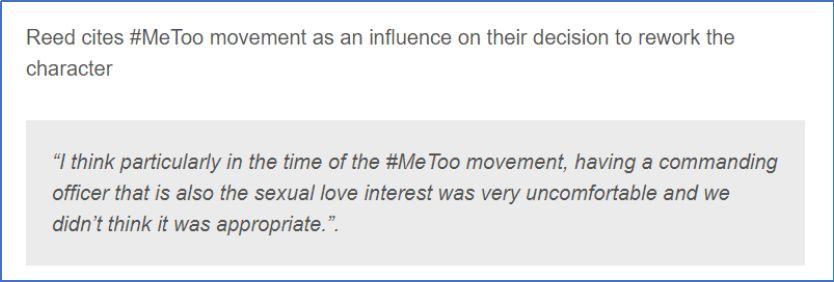 报道用“权力差异”(Power Differential)来形容里德提到的“不合适”:李将军是花木兰的上级,这种关系下的恋爱,有“职场性骚扰”的嫌疑。
