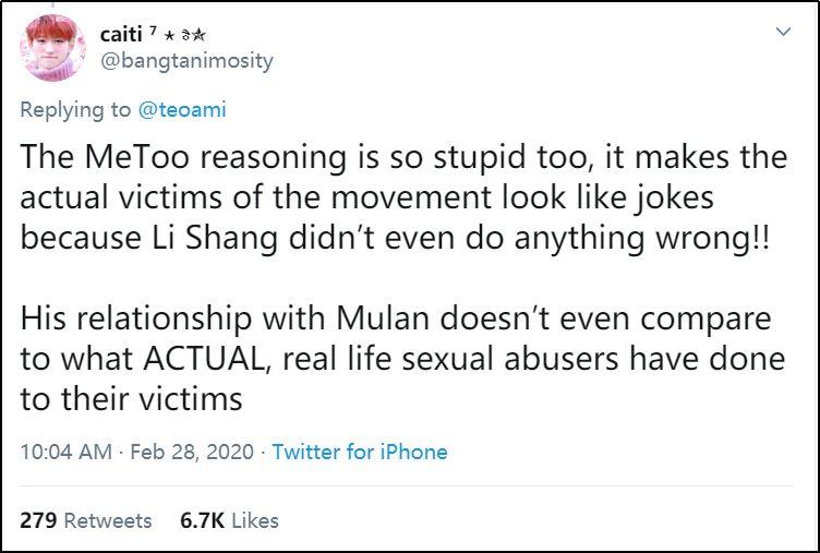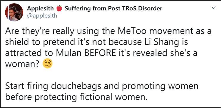 支持“反抗性骚扰”的不少观众表示,原作里李将军和花木兰的爱情是基于相互尊重的,片方先入为主地把他和性骚扰的人做类比,模糊了现实中性骚扰的本质。