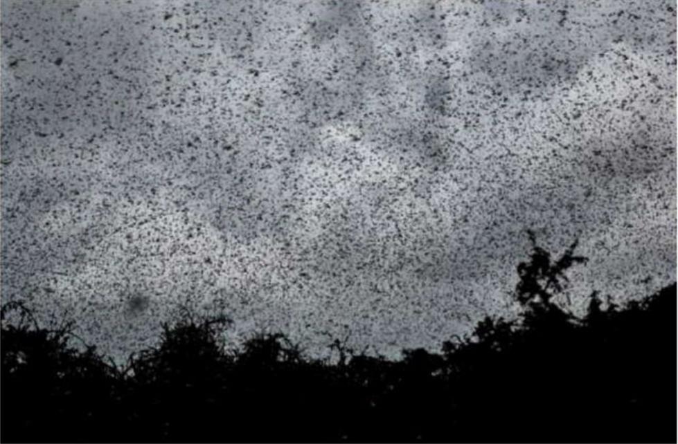 感受一下报道描述东非的蝗虫群:在东非的一些国家,蝗虫群像闪烁的乌云一样悬挂在地平线上。