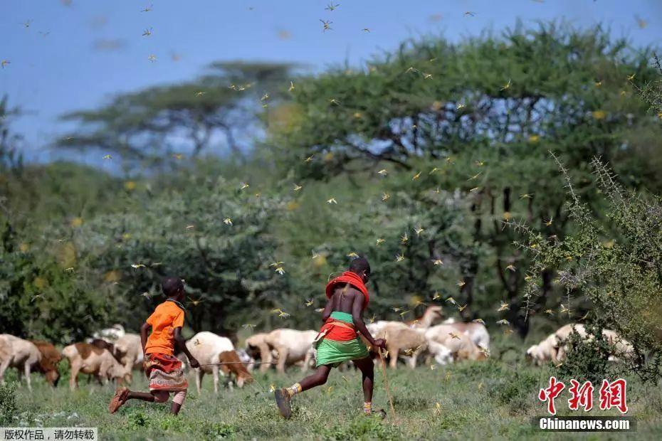 图为当地时间2020年1月21日,在肯尼亚Archers Post附近的拉里索罗村,穿着传统桑布鲁服装的年轻女孩跑过牛群时,入侵的蝗虫从地面植被中窜出。
