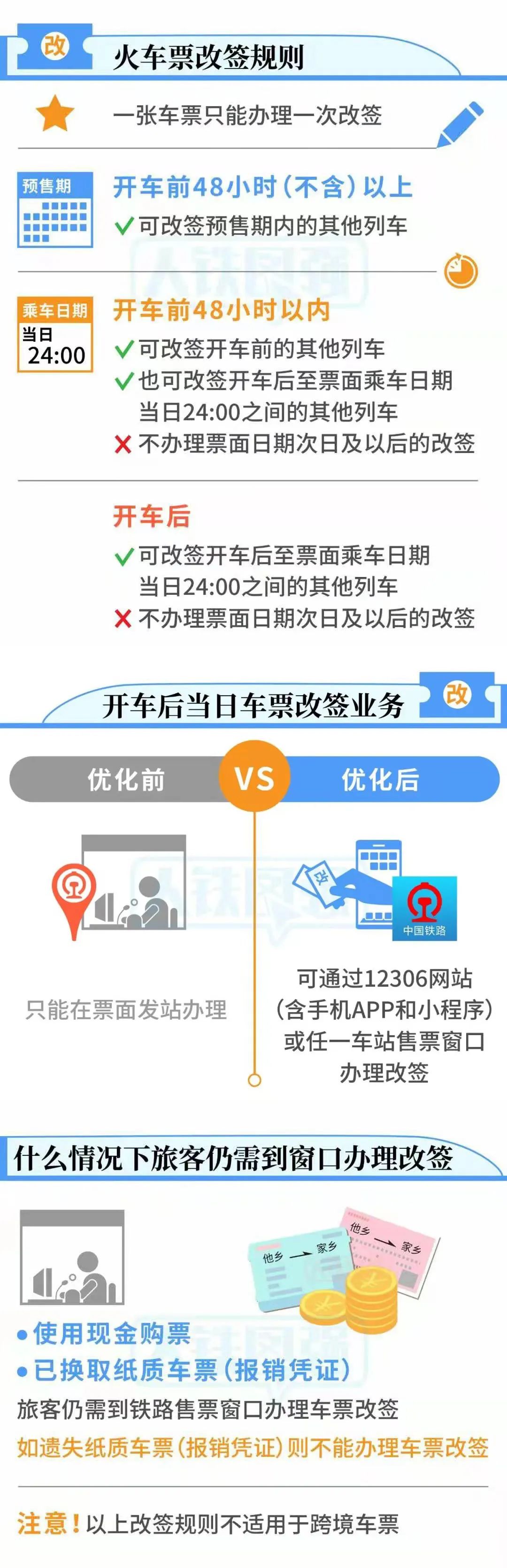 优化车票改签服务,在开车当日24时前其他列车尚有余票的情况下,可通过12306网站或任一车站改签窗口办理当日车票改签业务。