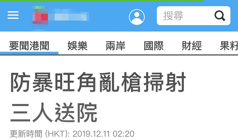 12月11日,香港《苹果日报》以“防暴旺角乱枪扫射 三人送院”为标题发文称,警方于12月10日凌晨在旺角一带驱散“市民”时曾以胡椒球“乱枪扫射”。↓