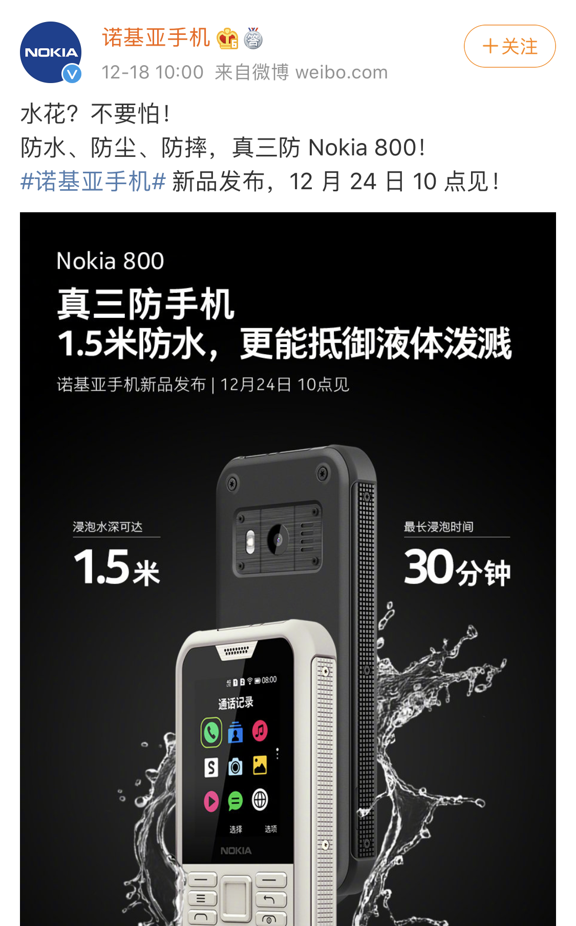 【环球网科技综合报道】12月18日消息,诺基亚手机宣布将于12月24日发布三防手机新品Nokia800。