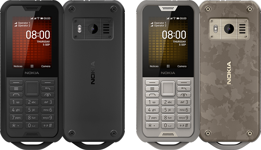 作为一款三防手机,Nokia 800通过了MIL-STD-810G军工级标准认证,防护级别为IP68,可在1.5米深水中浸泡30分钟,经受从1.8米的高度跌落。其外观非常硬朗,提供Black Steel和Desert Sand(中文名称未公布)两种配色,重161g,机身底部有专为绑定腕带设计的橡胶圈,顶部专门设置有一枚闪光灯作为手电筒使用,另提供3.5mm耳机接口。