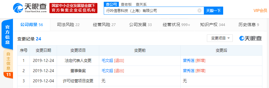 【环球网综合报道】天眼查数据显示,12月24日,小红书的运营主体行吟信息科技(上海)有限公司发生工商变更,公司创始人兼CEO毛文超卸任法定代表人、董事,由公司合伙人曾秀莲接任。