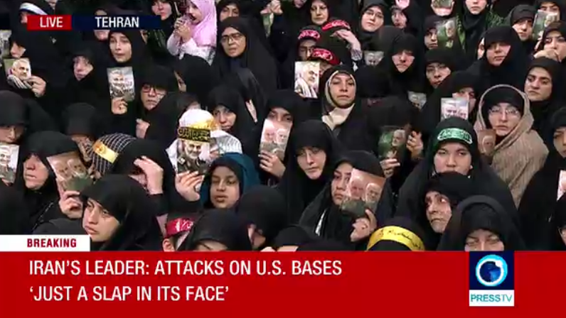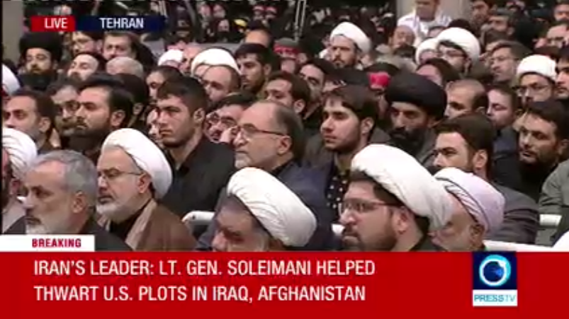 电视直播还显示,在哈梅内伊发表讲话时,几乎所有听众都举着苏莱曼尼将军的照片。