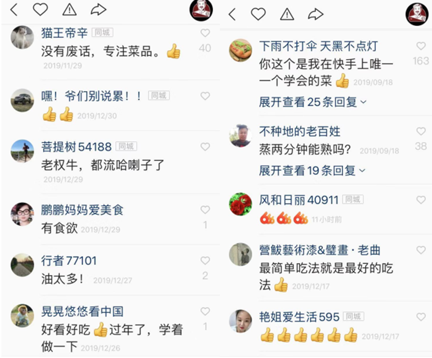 在快手,像福山老权这样的美食分享者还有很多。陕西老乔父子(快手ID:324186159)为老铁们讲地道的陕西家常美食,一句方言“美得很”引起众多陕西老铁的共鸣;山东的麻辣德子(快手ID:337178890)把给妻子和家人做饭的过程拍成段子,没想到有571万粉丝前来 “围观秀恩爱”;做户外野食的甩锅队长(快手ID: 710919245)在乡间的茅草屋过出了生活仪式感,对未来也有了明晰的职业规划;酒店大厨星园陈师傅(快手ID:1285256917)则主要教老铁们煲广式靓汤,通过一碗精心熬制的汤调理身体……从东北炖菜到广式早茶,从东部沿海的海鲜到西部内陆的烧烤,快手上天南海北的厨艺分享者们总能够带给每个漂泊在外的游子们最地道的家乡味道。