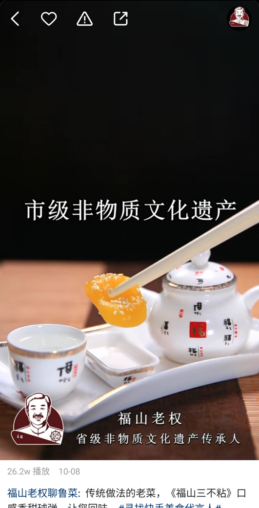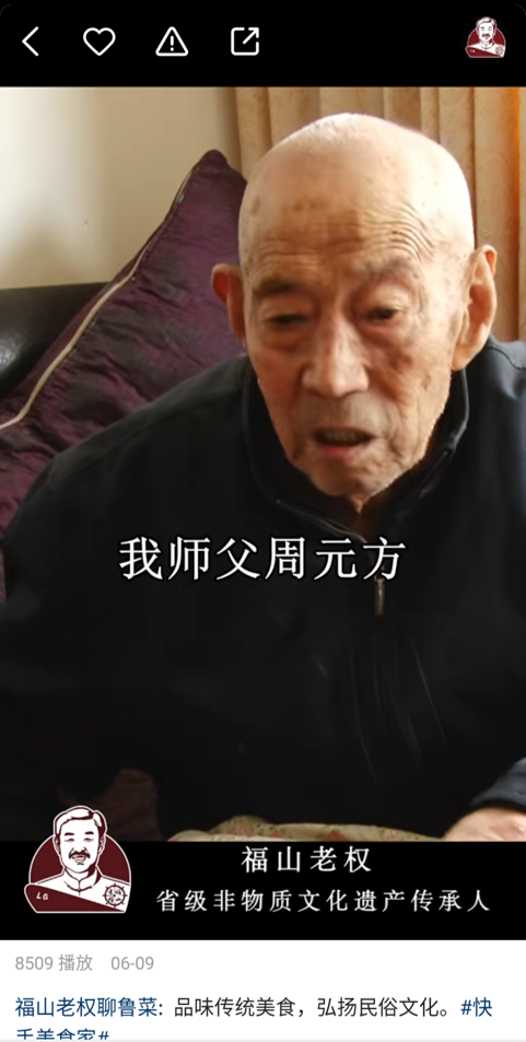 这是“福山老权聊鲁菜”( 快手ID:1345497492)每条视频的开头语,视频中他会介绍山东省人气旺、易上手的菜品,很多老铁跟着视频学做地道鲁味菜。