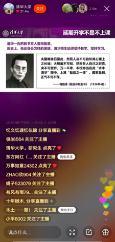 据悉,为实现“天涯若同窗,师生共课堂”的美好愿景,清华大学各个院系也将在延期开学期间,持续通过直播平台开展线上直播教学。