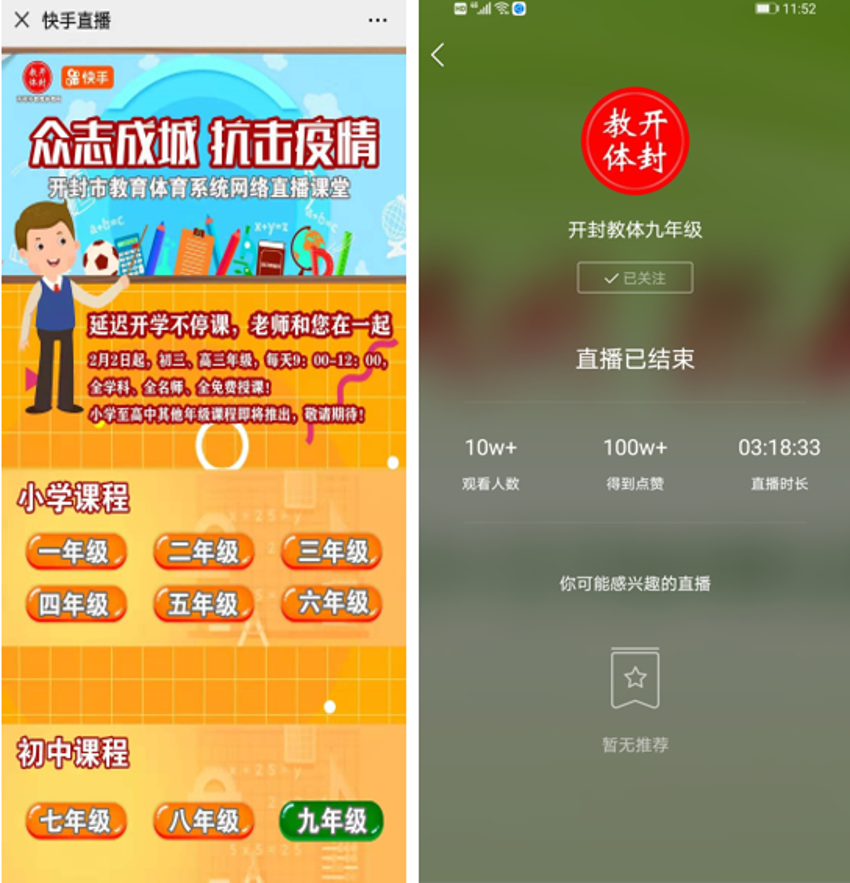 开封教体局联合快手直播授课,引来数万蹭课学子
