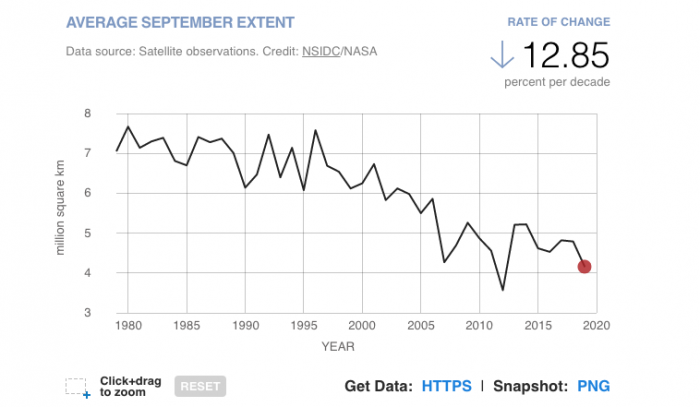 2016年,NASA的一项研究发现,融冰季节北极海冰总覆盖率比上世纪70年代末低40%。去年,英国另一项研究预测,北冰洋可能在未来20年内经历无冰的夏天。现在,NASA估算出北极海冰以每十年12.85%的速度减少。