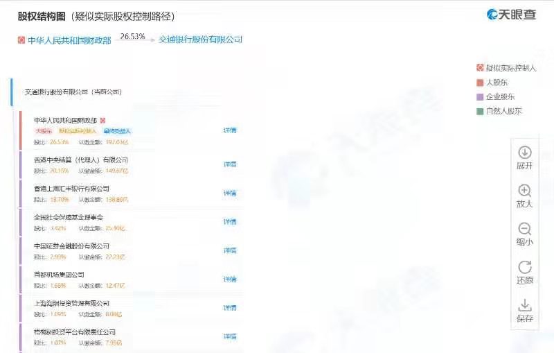 天眼查股权结构显示,财政部为该公司大股东,持股26.53%;香港中央结算(代理人)有限公司为该公司第二大股东,持股20.15%;香港上海汇丰银行有限公司为该公司第三大股东,持股18.70%。