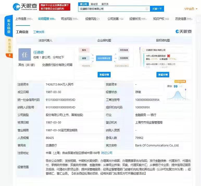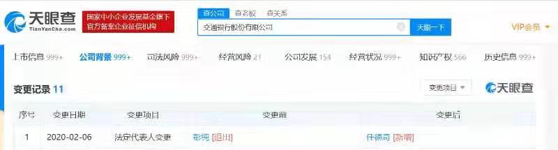 【环球网综合报道】天眼查数据显示,近日,交通银行的运营主体交通银行股份有限公司发生工商变更,彭纯卸任该公司法定代表人,由任德奇接任。此外,彭纯也退出了董事。