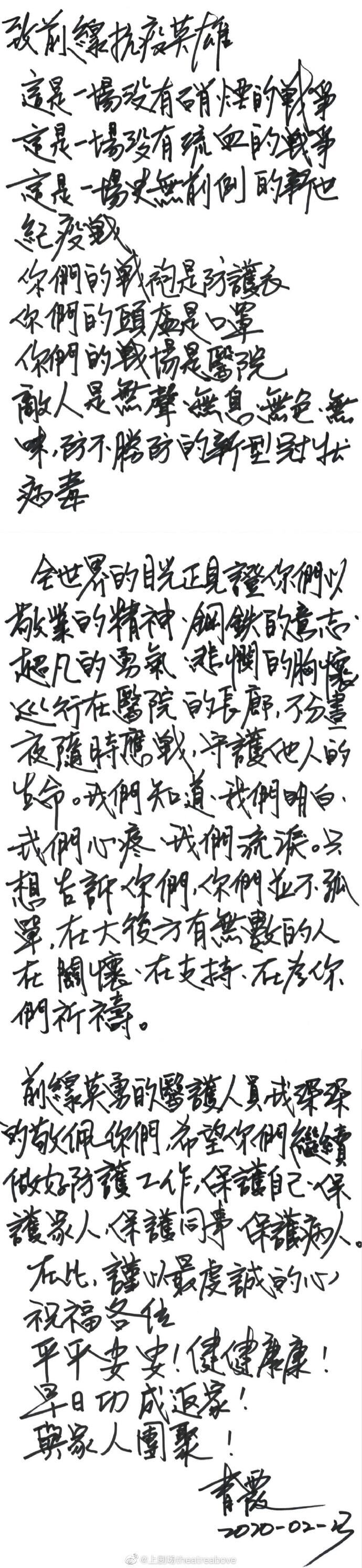 在上剧场公开的林青霞的亲笔信中,她写道:“致前线抗疫英雄:这是一场没有硝烟的战争,这是一场没有流血的战争,这是一场史无前例的新世纪疫战,你们的战袍是防护衣,你们的头盔是口罩,你们的战场是医院,敌人是无声无息无色无味、防不胜防的新型冠状病毒”。