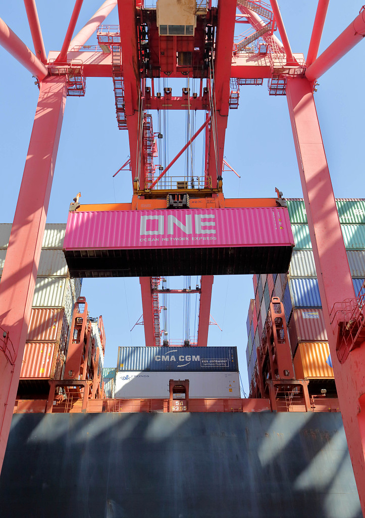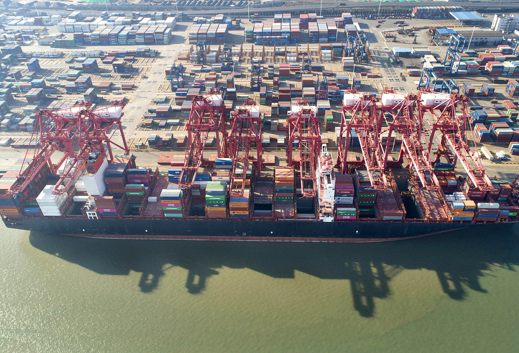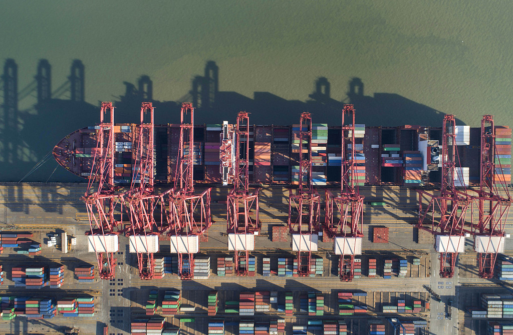 2020年3月15日,江苏省连云港港口集资箱码头,一艘大型集装箱货轮正在码头装卸集装箱(无人机拍摄)。图片使用说明 图片来源:视觉中国