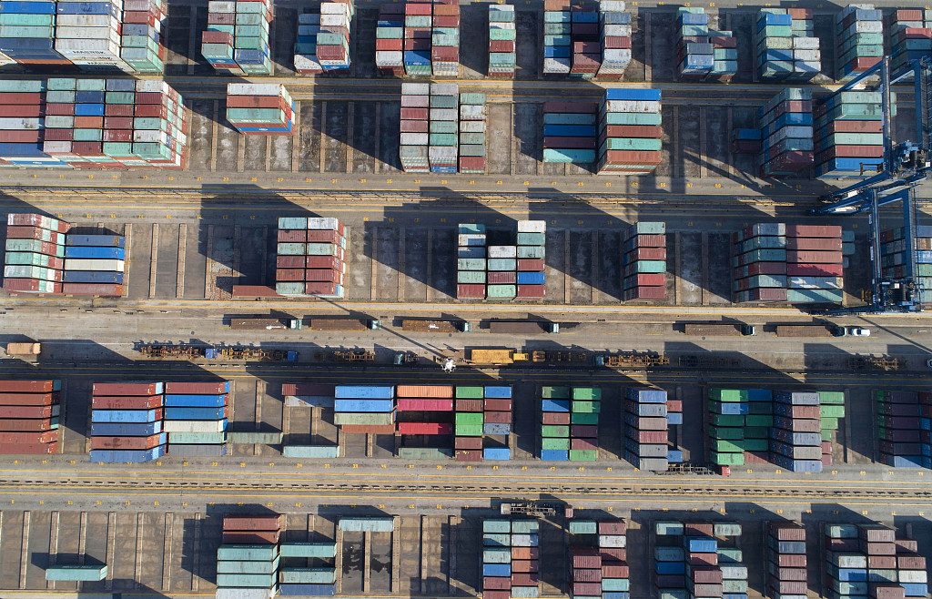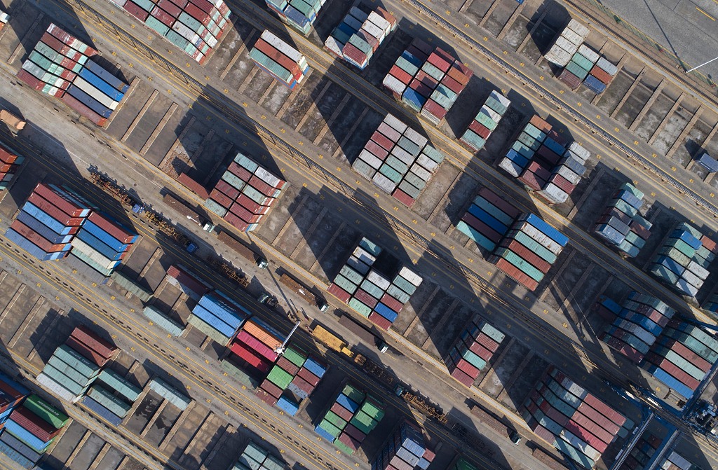 2020年3月15日,江苏省连云港港口集资箱码头堆场一角(无人机拍摄)。图片来源:视觉中国