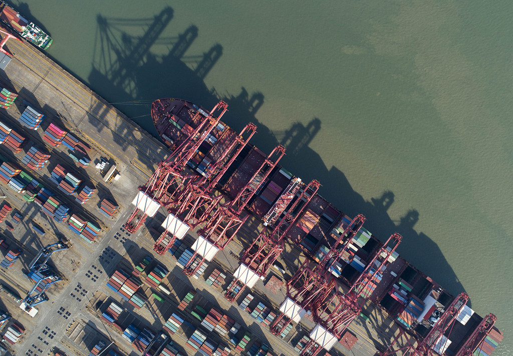 2020年3月15日,江苏省连云港港口集资箱码头,一艘大型集装箱货轮正在码头装卸集装箱(无人机拍摄)。图片来源:视觉中国