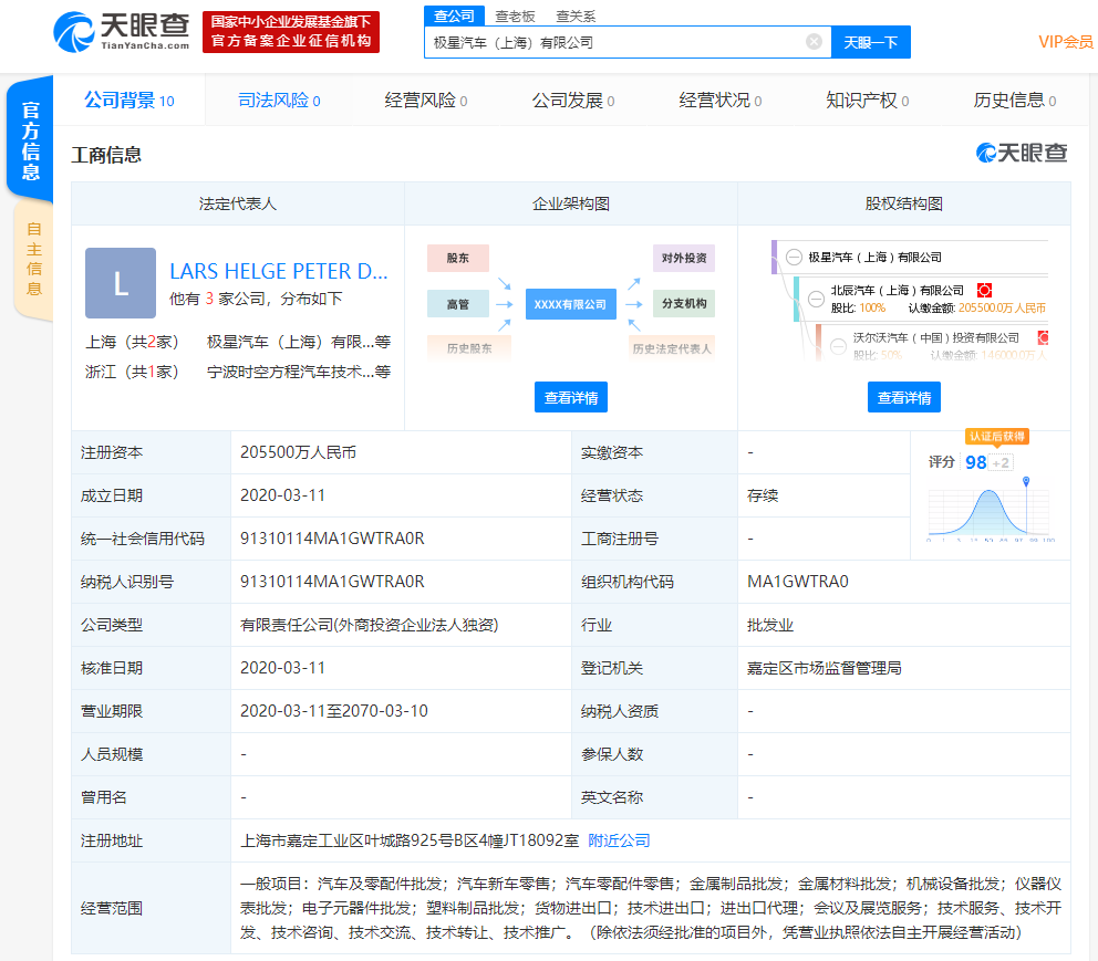 【环球网综合报道】天眼查数据显示,3月11日,极星汽车(上海)有限公司正式成立,该公司注册资本20.55亿人民币,法定代表人为LARS HELGE PETER DANIELSON,公司经营范围包括汽车及零配件批发;汽车新车零售;汽车零配件零售等,由Polestar(极星)的运营主体——北辰汽车(上海)有限公司全资控股。