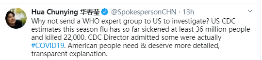“为什么不派遣一个世卫组织专家组去美国调查?美国疾控中心估计,本季流感迄今已造成至少3600万人患病,2.2万人死亡。美国疾控中心主任承认,其中有些人实际上患的是新冠肺炎。美国人民需要且应该得到更详细、更透明的解释。”
