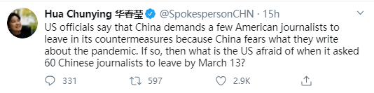 “美国官员表示,作为反制措施,中国要求一些美国记者离开,因为中国担心他们写有关这一流行病的报道。如果是这样,当美国要求60名中国记者在3月13日前离境时,美国又在害怕什么?”