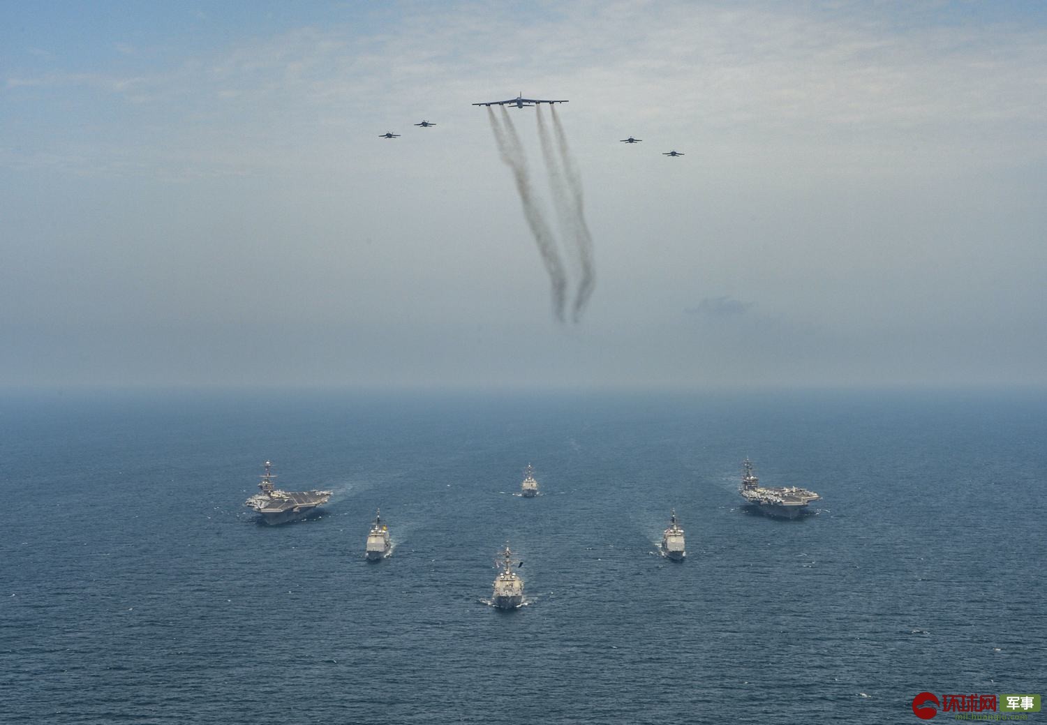 据美国军方公布的现场画面显示,“杜鲁门”号和“艾森豪威尔”号两个航母战斗群共6艘战舰在海面上进行编队航行训练,期间美国空军还出动部署在中东B-52H战略轰炸机,与航母舰载机组成混合编队,从两个航母战斗群上空飞过,这也是近年来美国海军和美国空军在中东“秀肌肉”达到的最新高度。