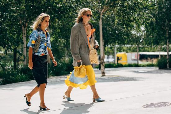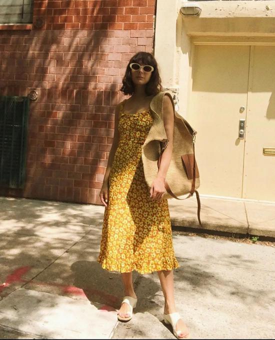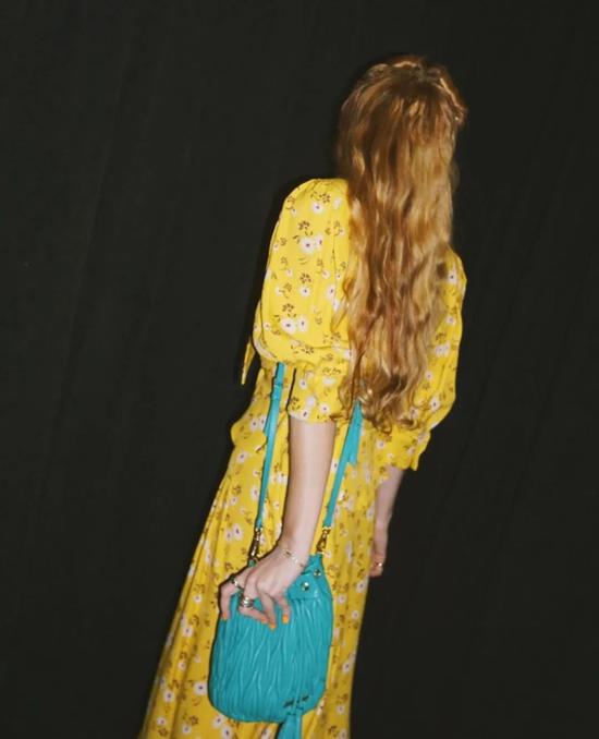 淡黄色作为碎花裙的底色真的是活力十足,吸睛但是又不会太高调,美得恰到好处。搭配一个亮色包包太春天了吧,色彩缤纷的。