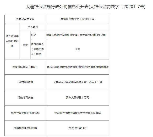 大银保监罚决字〔2020〕7号罚单显示,人保财险旅顺公司因委托未取得保险代理销售资格的机构从事保险销售活动,根据《保险法》第一百六十一条,中国银保监会大连银保监局作出对其罚款人民币三十万元的决定,处罚日期是2020年3月11日。
