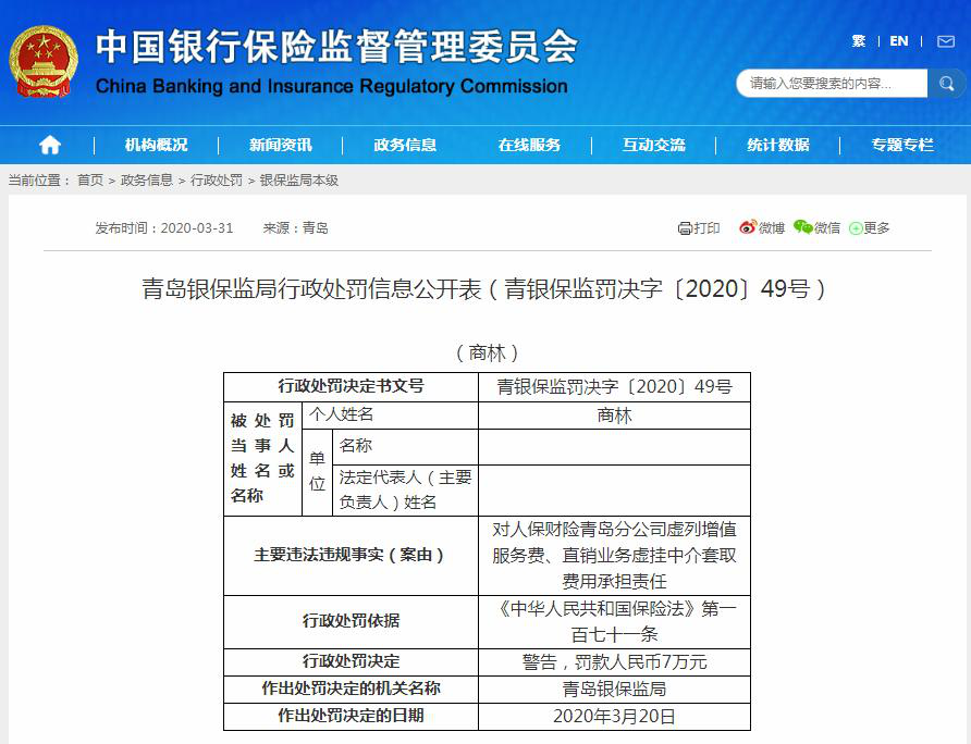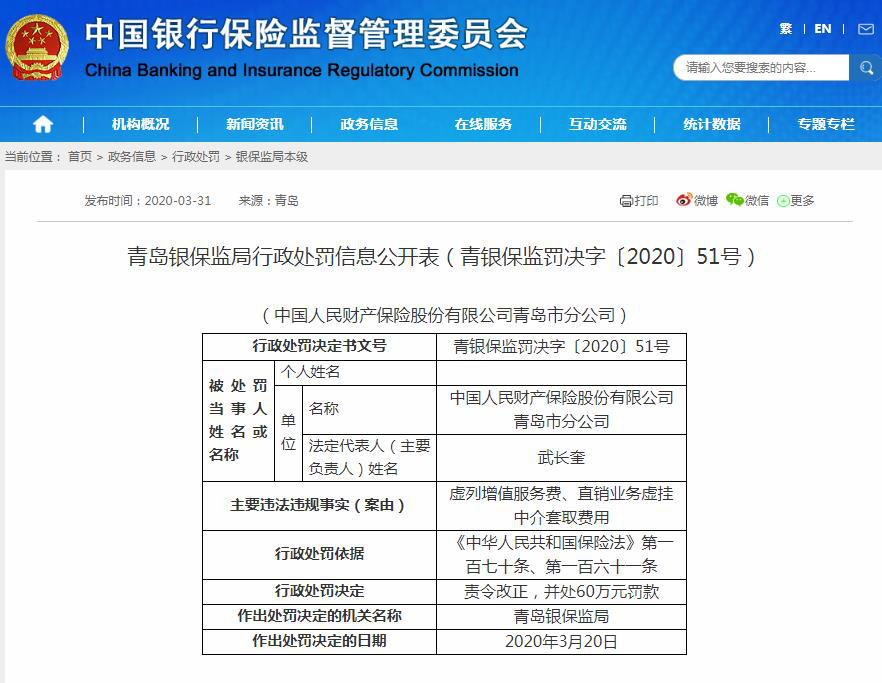 2020年3月31日,中国银保监会青岛银保监局公布了关于人保财险青岛市分公司的3则行政处罚信息,合计罚款74万元。