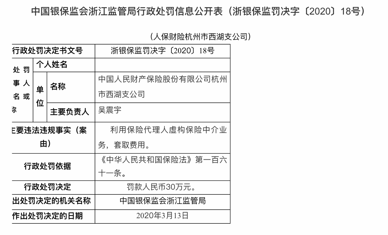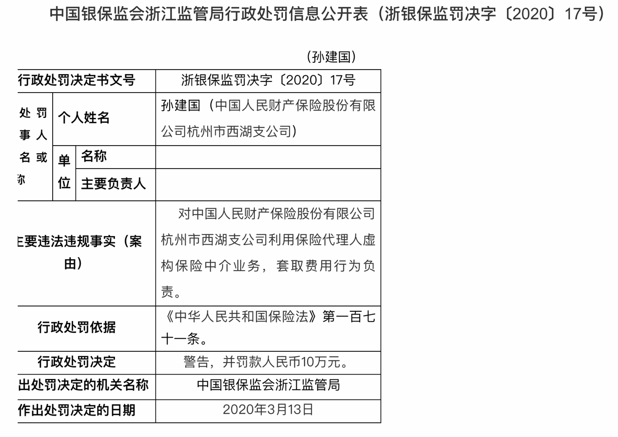 行政处罚信息表显示,人保财险杭州西湖支公司因存在利用保险代理人虚构保险中介业务,套取费用的违法违规事实,被浙江银保监局罚款30万元。同时,浙银保监罚决字〔2020〕17号显示,人保财险杭州市西湖支公司孙建国对人保财险杭州市西湖支公司利用保险代理人虚构保险中介业务,套取费用行为负责。依据《保险法》第一百七十一条,被警告并罚款人民币10万元。