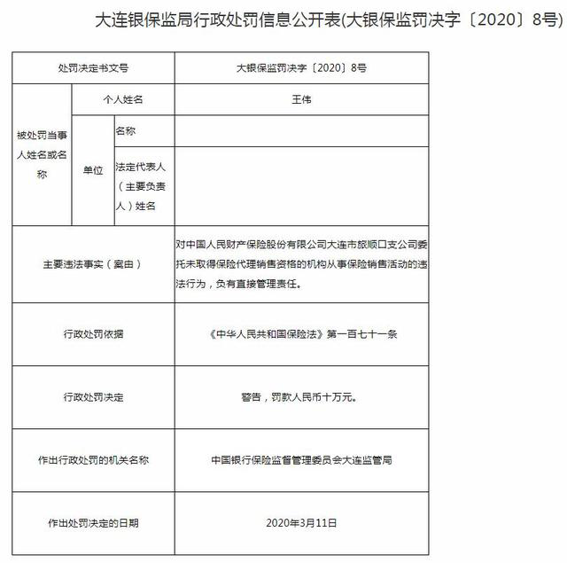 另外一份罚单中,大银保监罚决字〔2020〕8号显示,人保财险旅顺公司王伟对人保财险旅顺公司委托未取得保险代理销售资格的机构从事保险销售活动的违法行为,负有直接管理责任。根据《保险法》第一百七十一条,中国银保监会大连银保监局作出对其警告并罚款人民币十万元的决定。处罚日期是2020年3月11日。