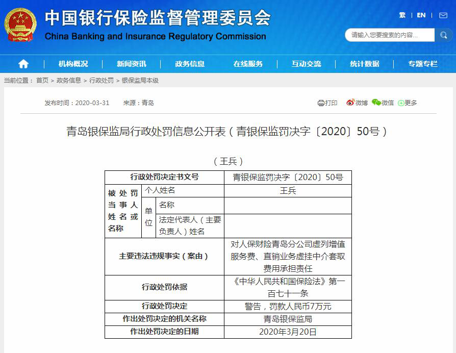 相关工作人员王兵,商林二人对人保财险青岛分公司虚列增值服务费、直销业务虚挂中介套取费用承担责任,监管给予警告,并各罚款人民币7万元,合计14万元。