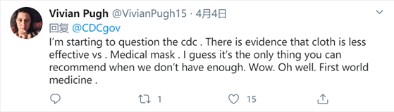 网友Vivian Pugh说:“我开始怀疑CDC了。有证据表明,布制(口罩)效果不如医用口罩。(但)当我们没有足够(医用口罩)时,我想这是你们唯一可以推荐的东西。哦好吧,(这就是)第一世界国家的医学(水平)。”↓