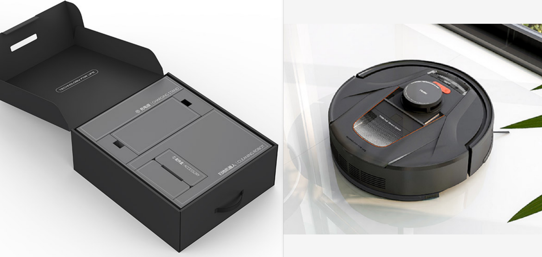 收到产品,笔者看到一个包装精致的黑色盒子,打开包装,主打“黑科技”概念的海尔P70扫地机此次采用的颜色是“珠光灰”,色系高贵百搭,适合不同风格的居家家具陈设。其正面顶部设有开关、陀螺仪传感器和安防监控器。