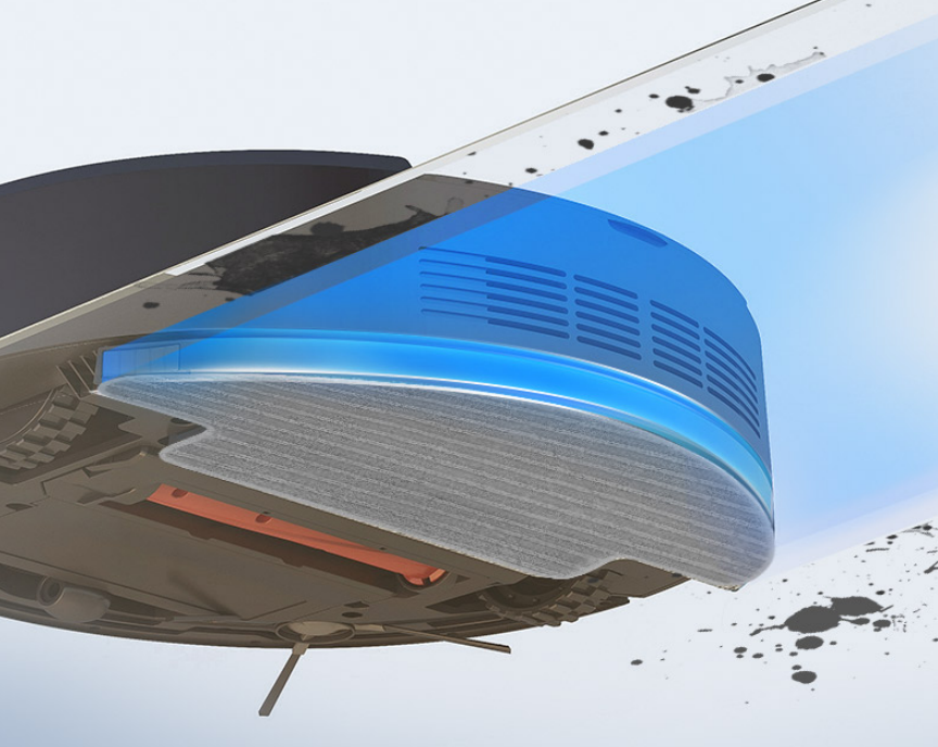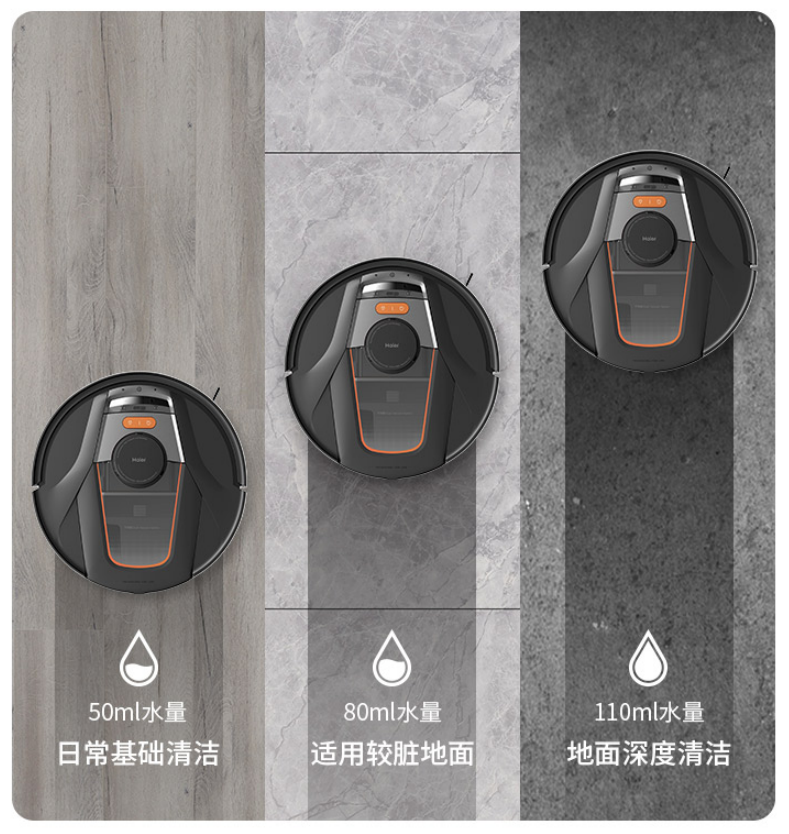 为了增强测试难度,笔者指挥海尔P70来到厨房清扫刚刚被宠物打翻的酱油和洒在地上的果汁,发现在经过污渍时,扫地机会比在干净地面区域渗水多一些,这样就更方便清理更加“顽固”的污渍。经过研究,笔者发现了其中的原理,海尔P70的5.0浮动增压电控水箱设计,可以利用自身重力感知地面起伏,利用微感技术调节渗水量,做到智能控水,也避免了地面积水问题的出现;另外,其创新"Y"型仿人工拖地路径,实现同一个位置强拖两遍,可谓机器人领域的“强迫症”。