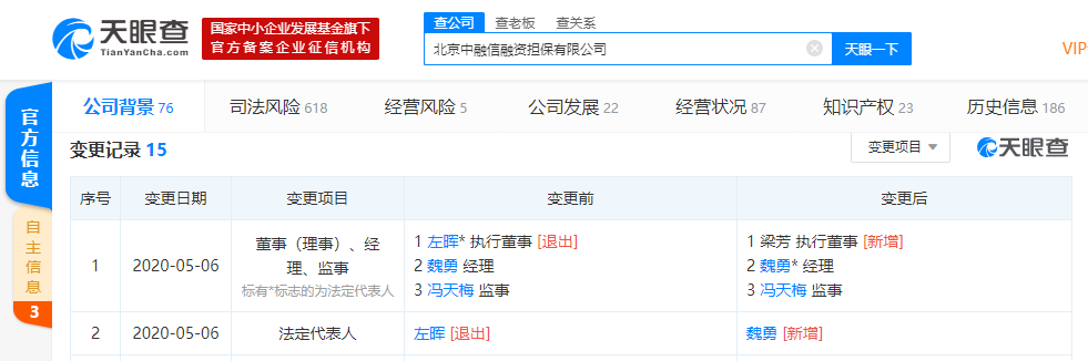 【环球网综合报道】天眼查数据显示,近日,北京中融信融资担保有限公司发生工商变更,左晖卸任该公司法定代表人,由魏勇接任。同时,左晖不再担任执行董事一职,由梁芳接任。