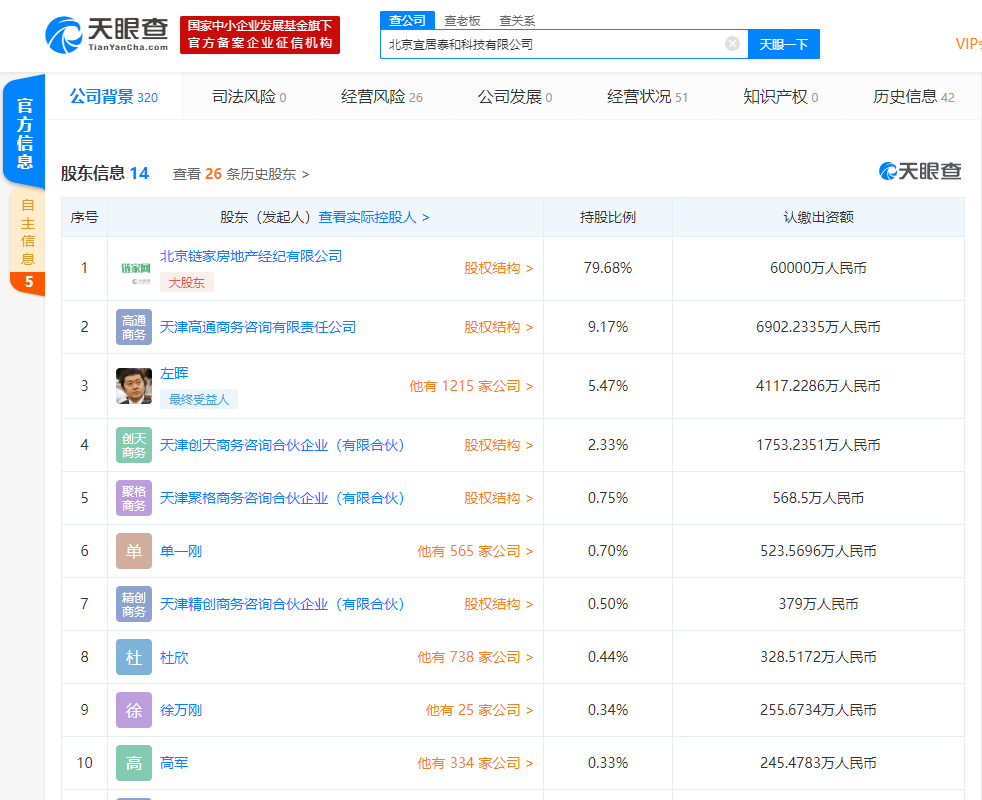 值得一提的是,近日,北京宜居泰和科技有限公司发生一系列工商变更,新增股东北京链家房地产经纪有限公司,认缴出资额为6亿元人民币,持股比例79.68%。此外,宜居泰和科技的注册资本由此前的约1.53亿增至约7.53亿,增幅超392%。左晖在宜居泰和科技的股权比例则从26.90%下降为5.47%。