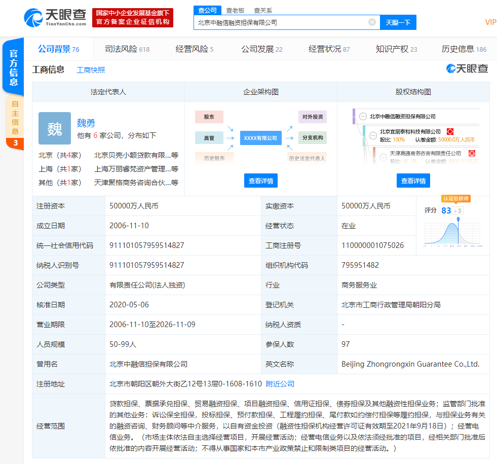 北京中融信融资担保有限公司成立于2006年11月,注册资本5亿人民币,经营范围包括贷款担保、票据承兑担保、贸易融资担保、项目融资担保、信用证担保、债券担保及其他融资性担保业务等。据乐居财经报道,该公司是链家旗下专门从事不动产按揭服务的专业机构,魏勇则为链家地产党委书记,链家地产副总裁,链家理财CEO。