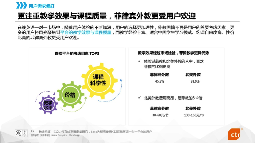 随着在线英语一对一行业的快速发展,用户心智愈发成熟,盲目以“外教国籍”评判教学效果的观念已被摒弃。《研究》数据显示,45.8%的受访用户最喜欢菲律宾外教,高于北美及其他地区外教。