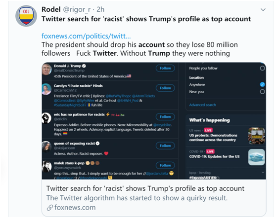 “福克斯新闻”表示,搜索“种族主义者(racist)”发现特朗普的推特账户出现在“用户”标签下第一个位置。即使在匿名模式或者在没有登录推特账户的情况下进行搜索,结果仍旧相同。