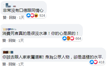 有网友在梁文杰脸书下方留言痛批,“非常没有口德跟同情心”,“消费死者真的是很没水准!你的心是黑的”,“你该去跟人家家属道歉!身为公众人物,却是这样的水平。”