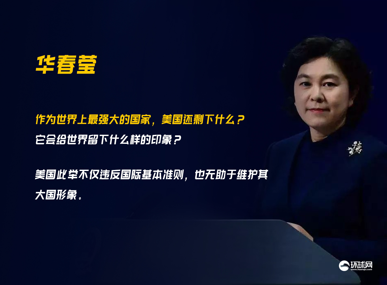 “作为世界上最强大的国家,美国还剩下什么?它会给世界留下什么样的印象?”华春莹在当天举行的外交部例行记者会上回应相关问询时表示,美国此举不仅违反国际基本准则,也无助于维护其大国形象。