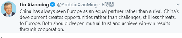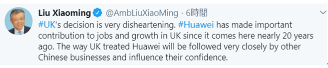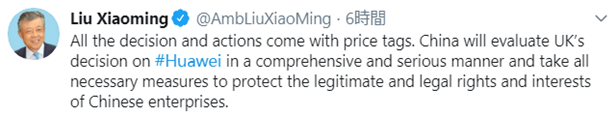 16日,刘晓明发布推文写道:“所有的决定和行动是有代价的。中国将全面、认真地评估英方关于华为的决定,采取一切必要措施保护中国企业的合法权益。”
