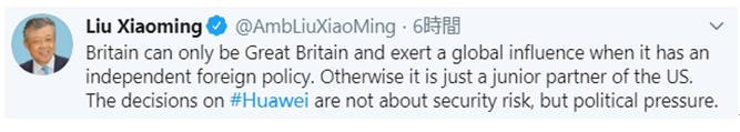在下一条推文中,刘晓明表示,英国只有在独立自主的外交政策下,才能成为“大不列颠”,才能发挥全球影响力。否则,它只是美国的一个次要的合作伙伴。英方关于华为的决定不是关于所谓的安全风险,而是政治压力。